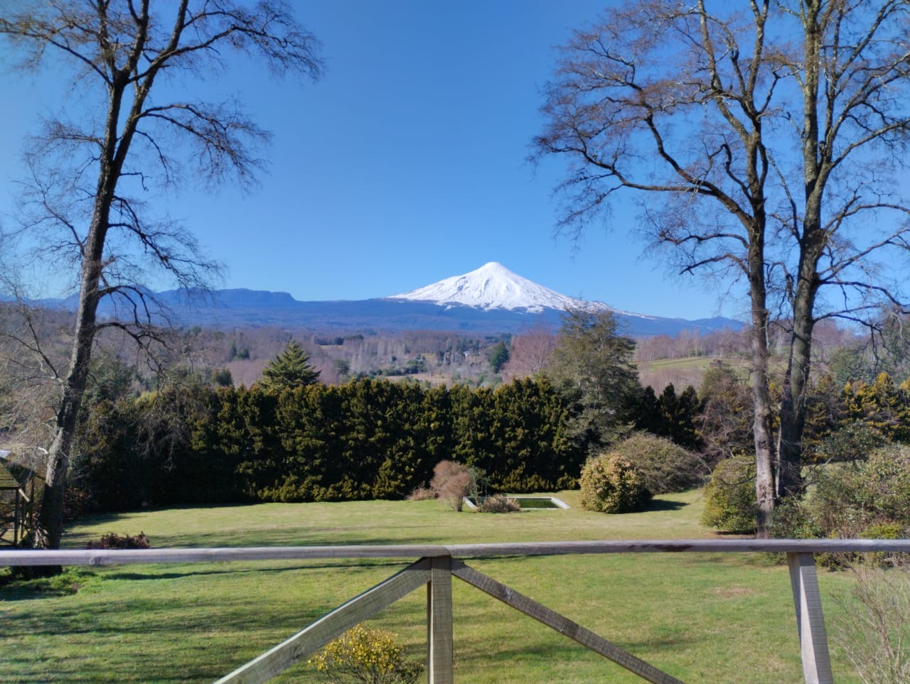 La vista al Volcán Villarrica es de las mejores en la zona, un espectáculo desde la comodidad de la casa, el volcán se aprecia desde su base. Y los campos aledaños se muestran verdes y hermosos. Simplemente una vista soñada.