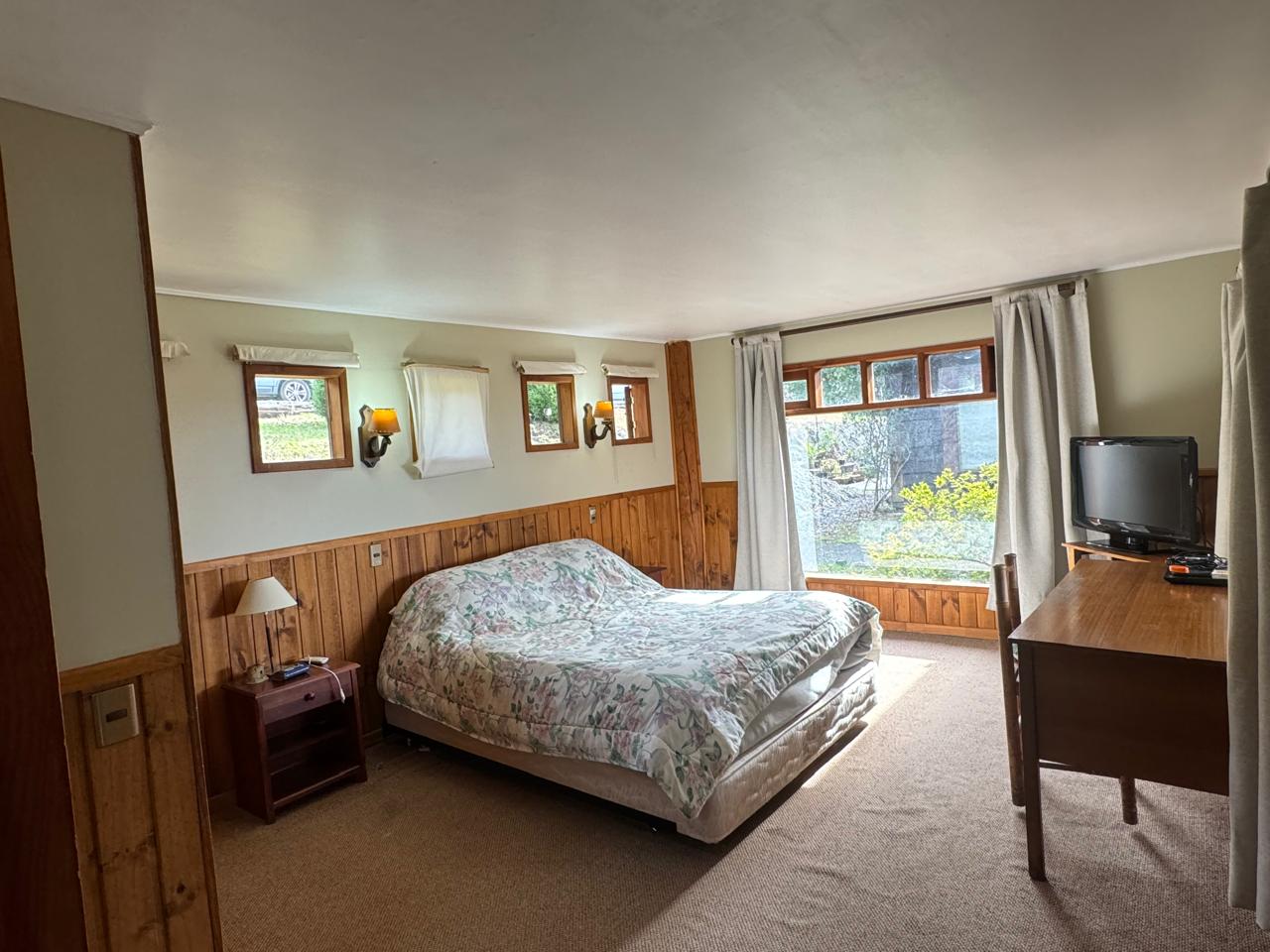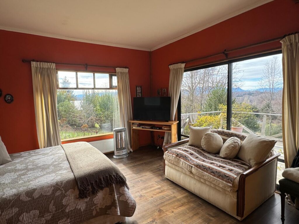 1 dormitorio en suite con closet de pared, baño con tina y estupenda vista al volcán Villarrica.