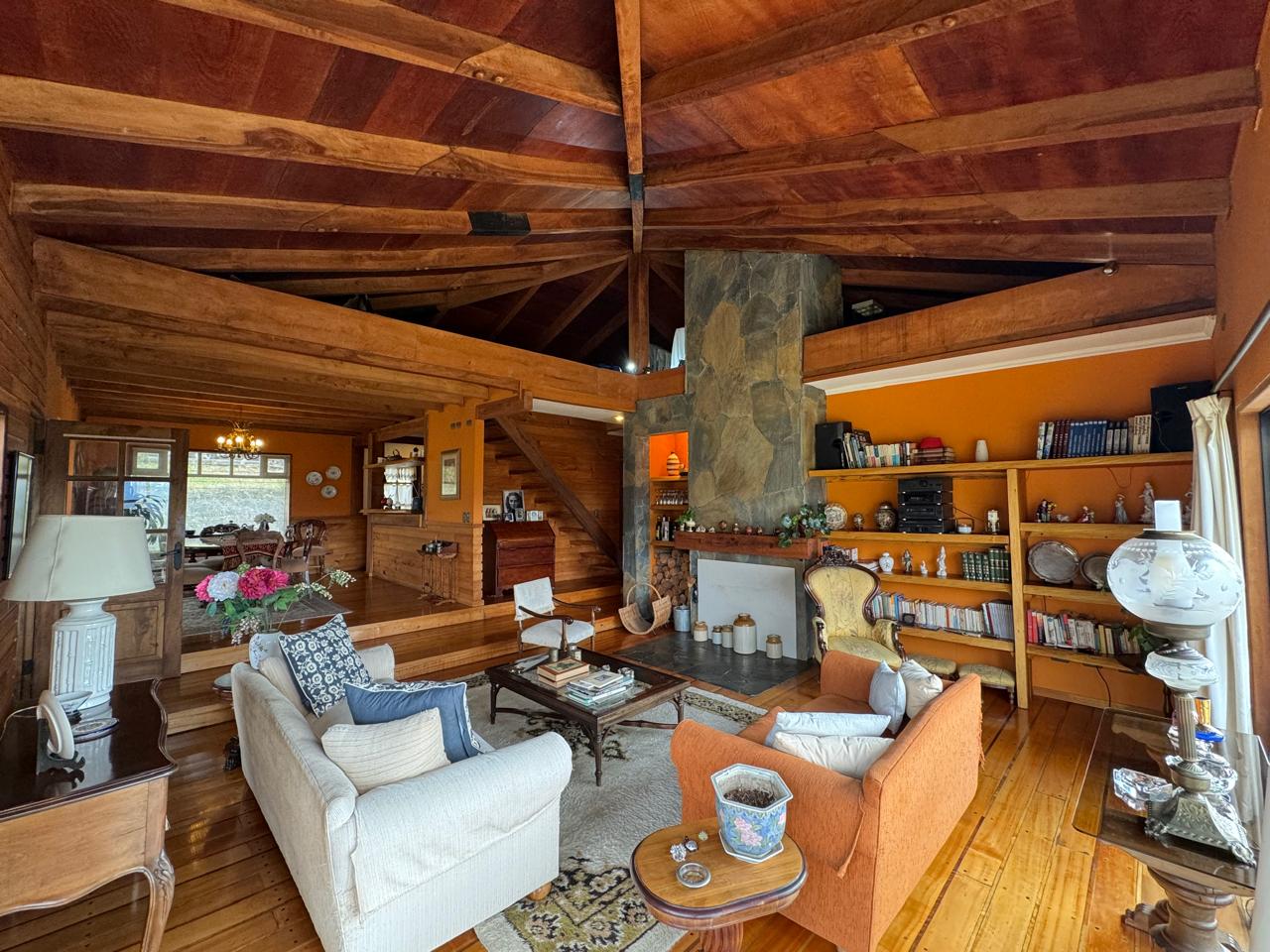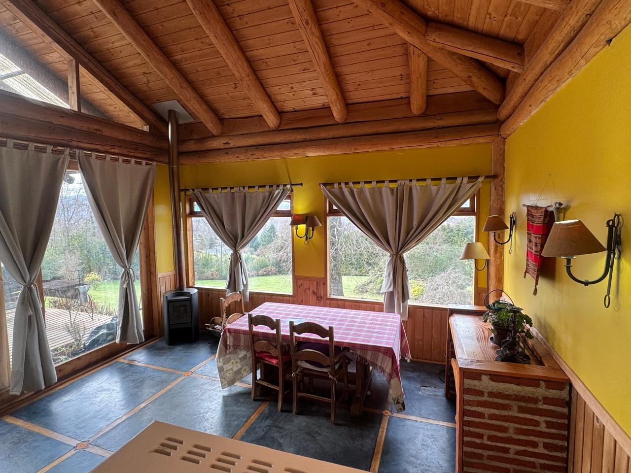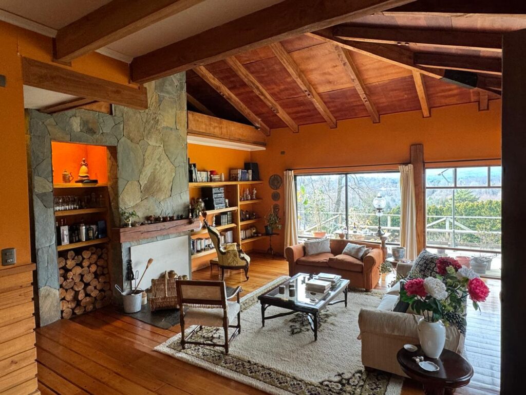 Living comedor con chimenea y salida a gran terraza e imponente vista al volcán Villarrica.